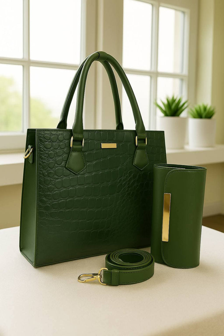 Description: Indulge in timeless luxury with the Midnight Croc. This chic handbag and wallet combo is designed for the woman who appreciates classic elegance with a touch of texture. The sophisticated crocodile-embossed finish exudes undeniable style, making it the perfect accessory for both day and evening wear.